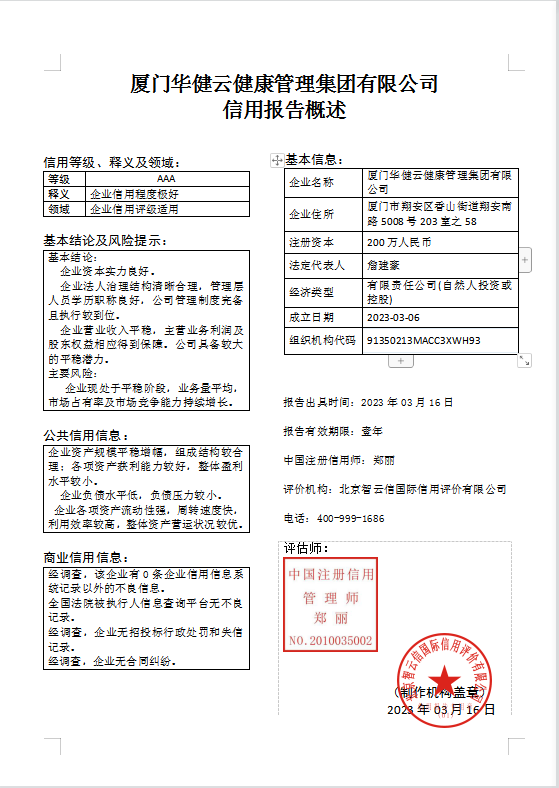 一、專業(yè)第三方信用評價機構根據國務院《社會信用體系建設規(guī)劃綱要(2014-2020年)》(國發(fā)2014第21號)建設要求,依據中華人民共和國信用行業(yè)標準對該單位的相關信用信息進行綜合評價,并依法出具信用證書和建立信用檔案公示,接受社會監(jiān)督。信用分析師認為,同等條件下,該單位的可信度、信任度和社會責任度相對很高。