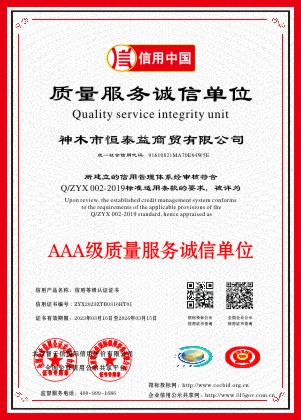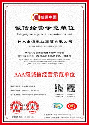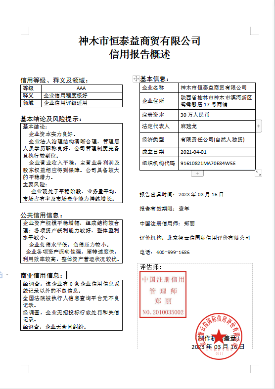 二、本信用證書和信用檔案是中立和中性的,它證明該單位已納入社會(huì)信用體系的監(jiān)督之中,任何組織和個(gè)人可以遵循誠(chéng)信原則方便地對(duì)該單位進(jìn)行評(píng)價(jià)(表?xiàng)?、批評(píng)、建議);任何組織和個(gè)人可以方便地查詢?cè)搯挝涣己眯畔?、不良信息和整改信息。該單位也可以通過(guò)誠(chéng)信經(jīng)營(yíng)不斷增加信用分值和增加良好信用信息記錄,積累信用無(wú)形資產(chǎn)。三、根據(jù)該單位提供的相關(guān)資料,依據(jù)中華人民共和國(guó)信用行業(yè)標(biāo)準(zhǔn)Q/ZYX 002-2019《企業(yè)信用評(píng)價(jià)體系標(biāo)準(zhǔn)》,專業(yè)第三方信用評(píng)價(jià)機(jī)構(gòu)或信用認(rèn)證機(jī)構(gòu)對(duì)其信用等級(jí)評(píng)定為:AAA 級(jí)。四、提醒該信用檔案、信用證書及信用銘牌的使用者:請(qǐng)密切關(guān)注合作和交易對(duì)方的各項(xiàng)信用指標(biāo)或最新信用報(bào)告或年檢記錄信息,整體把握信用風(fēng)險(xiǎn),以保障合作和交易安全;請(qǐng)隨時(shí)關(guān)注合作和交易對(duì)方的信用動(dòng)態(tài)變化或跟蹤評(píng)價(jià)報(bào)告,及時(shí)把握信用趨勢(shì),以掌控商業(yè)風(fēng)險(xiǎn)。信用是企業(yè)的生命線;信用檔案是企業(yè)信用評(píng)價(jià)結(jié)果的動(dòng)態(tài)記錄,具有法律效力的信用證書是企業(yè)、商家及網(wǎng)站的第二“信用身份證”,信用檔案和信用證書是企業(yè)、商家及網(wǎng)站獲得客戶信任、促成合作和交易的基礎(chǔ),是大眾消費(fèi)、合作和交易決策的重要依據(jù),是我國(guó)社會(huì)信用體系建設(shè)的公平保障體系。